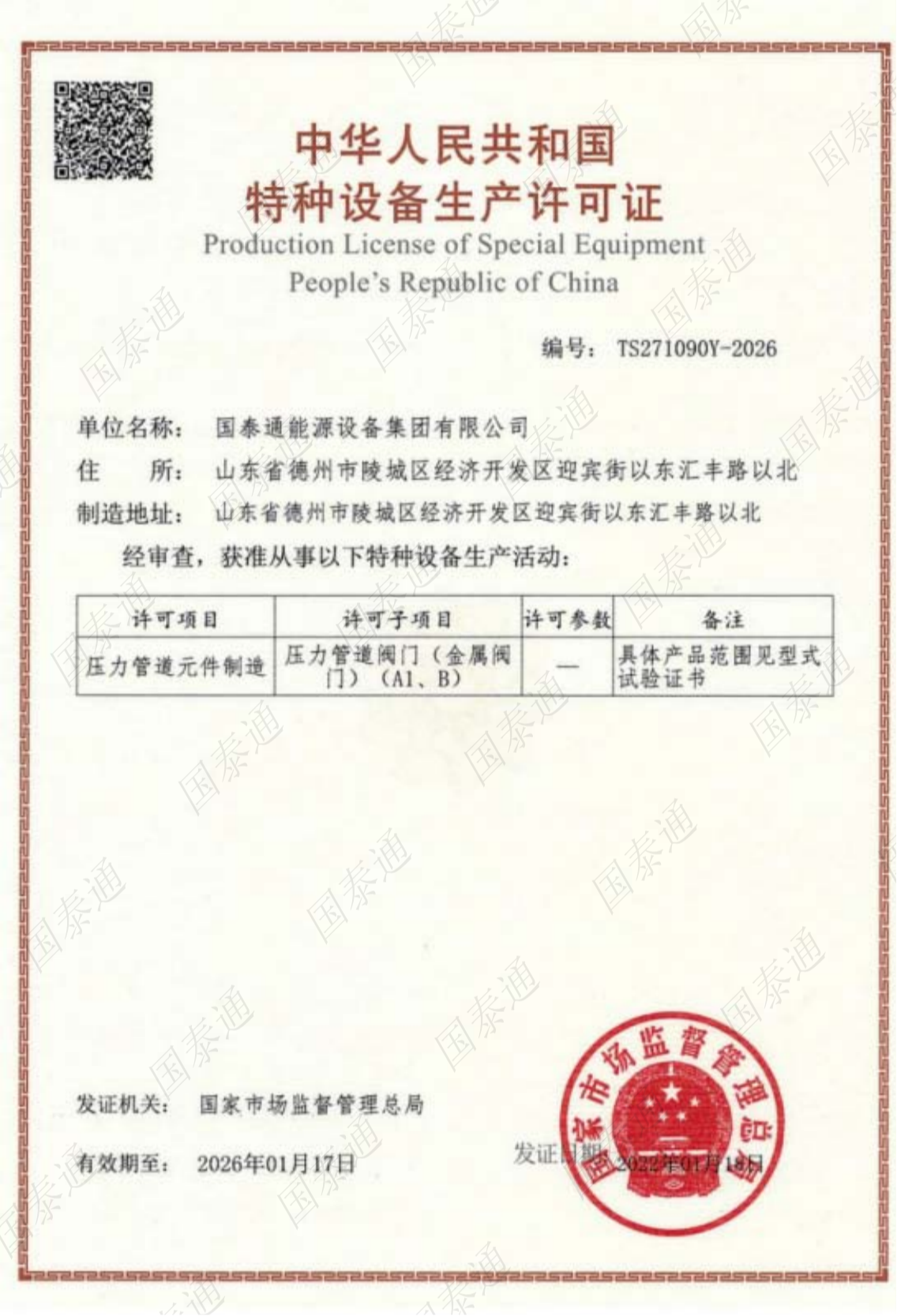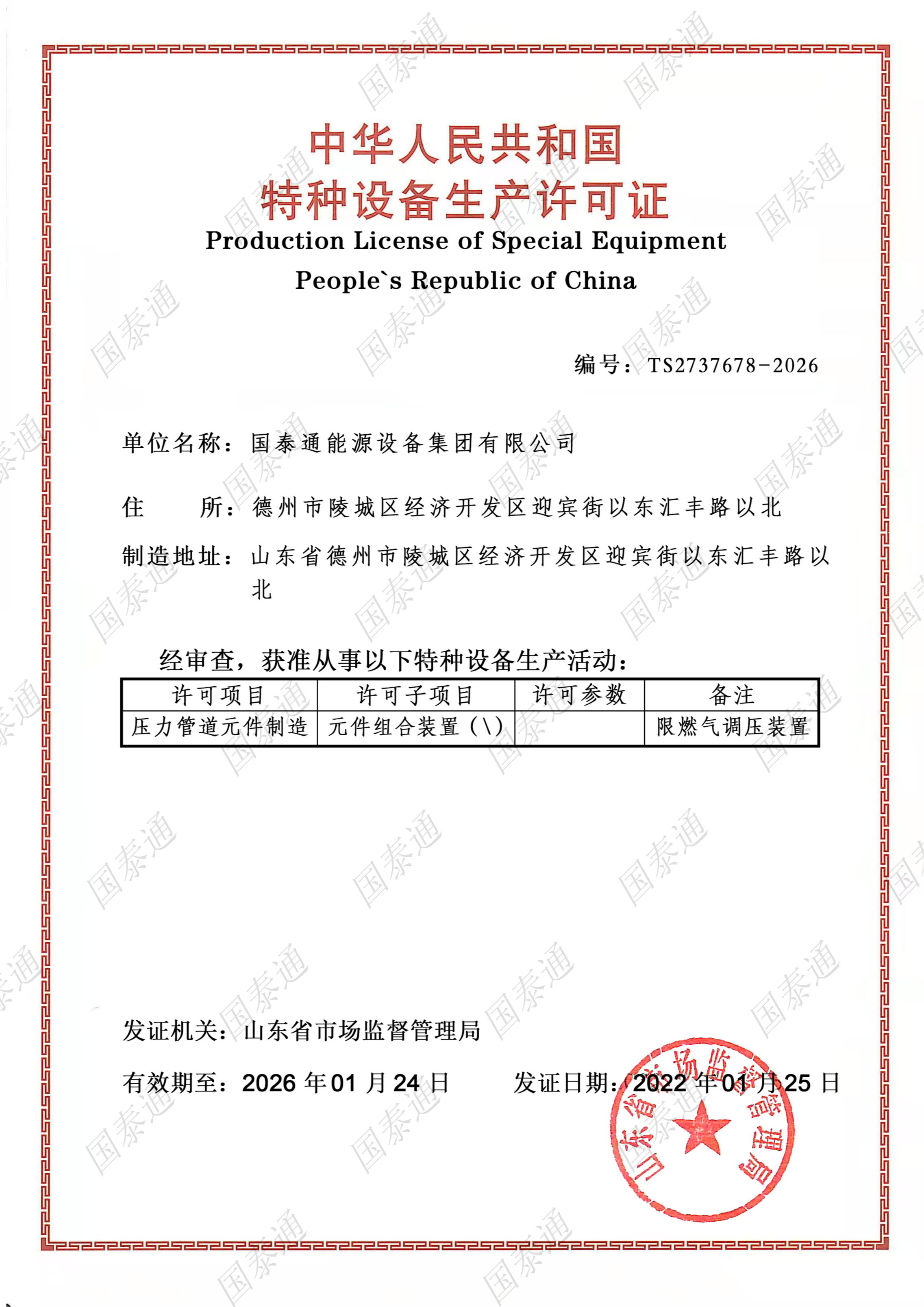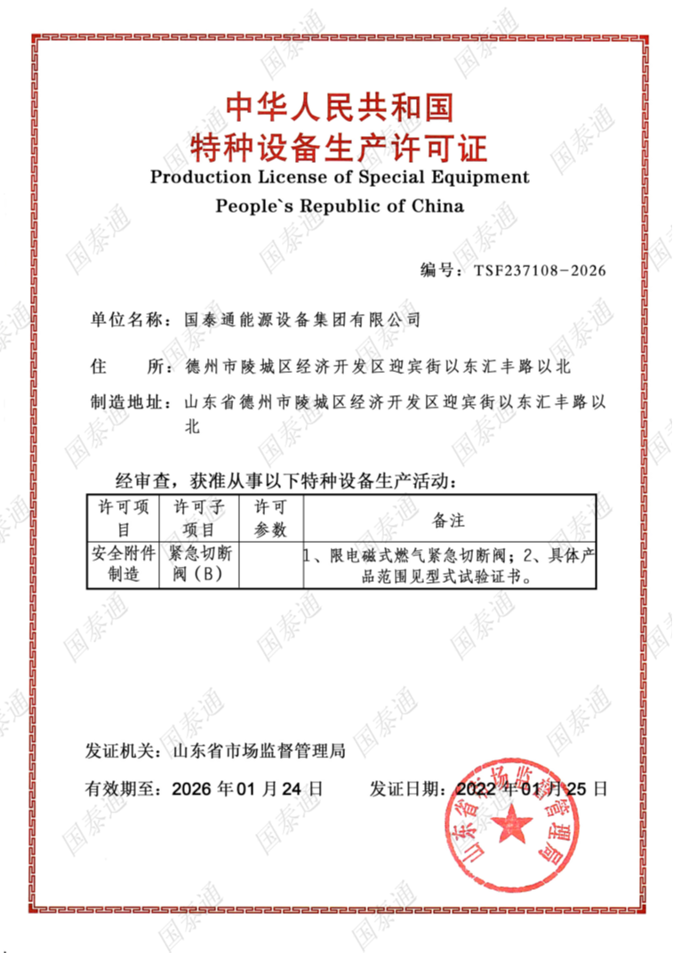 國泰通能源設備集團有限公司是一家國家級高新技術企業,專注于閥門和燃氣調壓輸配設備設計、研發、生產、銷售、服務于一體的系統集成解決方案服務商。公司成立于2011年,注冊資金10168萬元,擁有北京運營中心和山東生產中心兩大基地,北京運營中心主要承擔集團公司的戰略規劃發展,山東生產基地承擔集團公司產品研發、生產和銷售服務,集團公司山東生產基地占地面積5萬余平方米,總建筑面積3萬余平方米,有著現代化的廠房和辦公大樓。集團公司經過十多年的茁壯發展,現擁有中、高級工程師27名,生產服務技術人員二百余人......